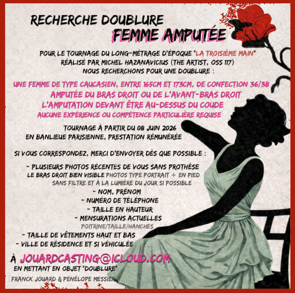 - La doublure de l’une des comédiennes principales, qui doit être de type caucasien, mesurant entre 165cm et 173cm, de confection 36/38 et amputée du bras droit ou de l’avant-bras droit jusqu’au dessus du coude.
