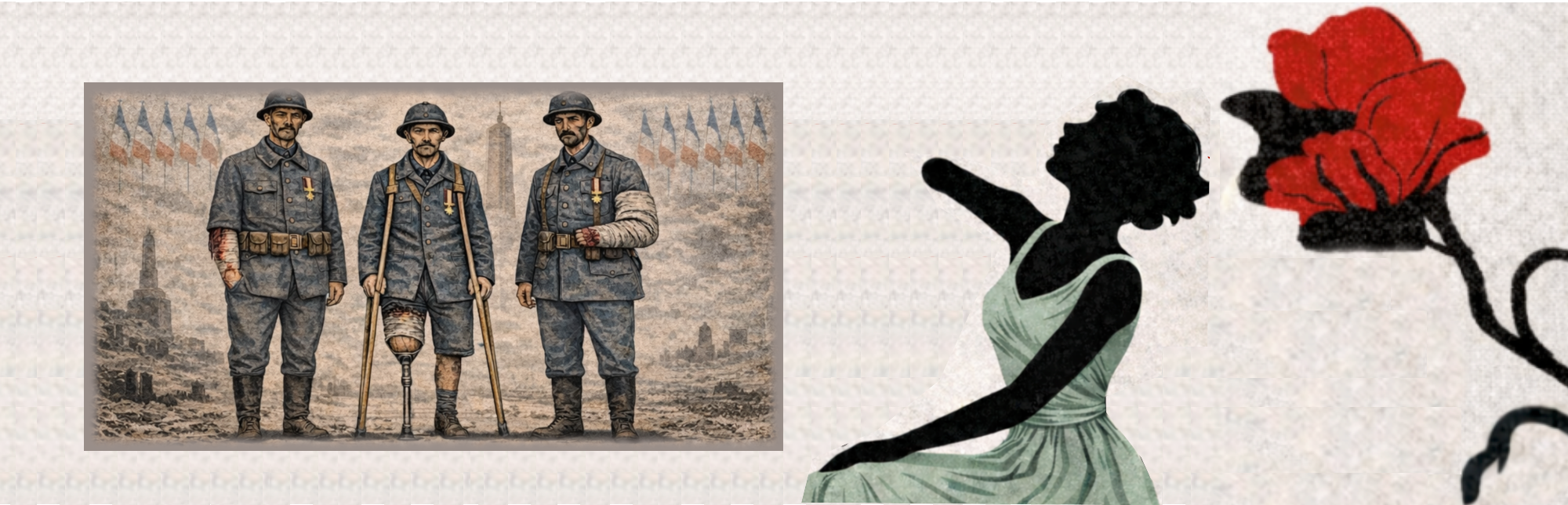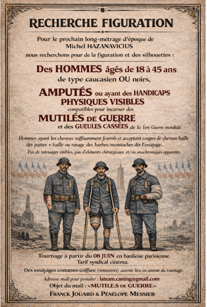 - Des figurants de type caucasien ou noirs, de 18 à 45 ans, amputés ou ayant des handicaps physique compatibles pour incarner des mutilés de guerre de la 1ère Guerre Mondiale.